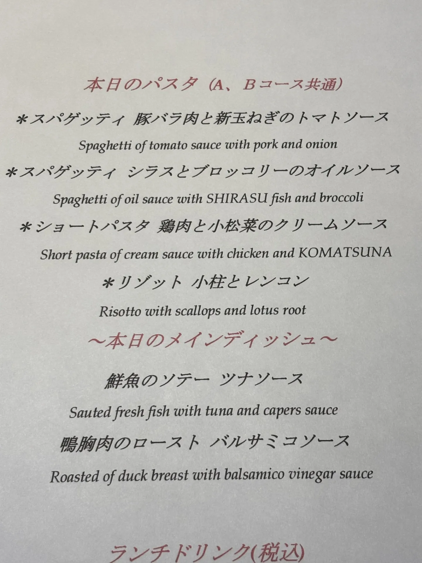 全日ランチタイムにご用意する、パスタ、メインディッシュです。